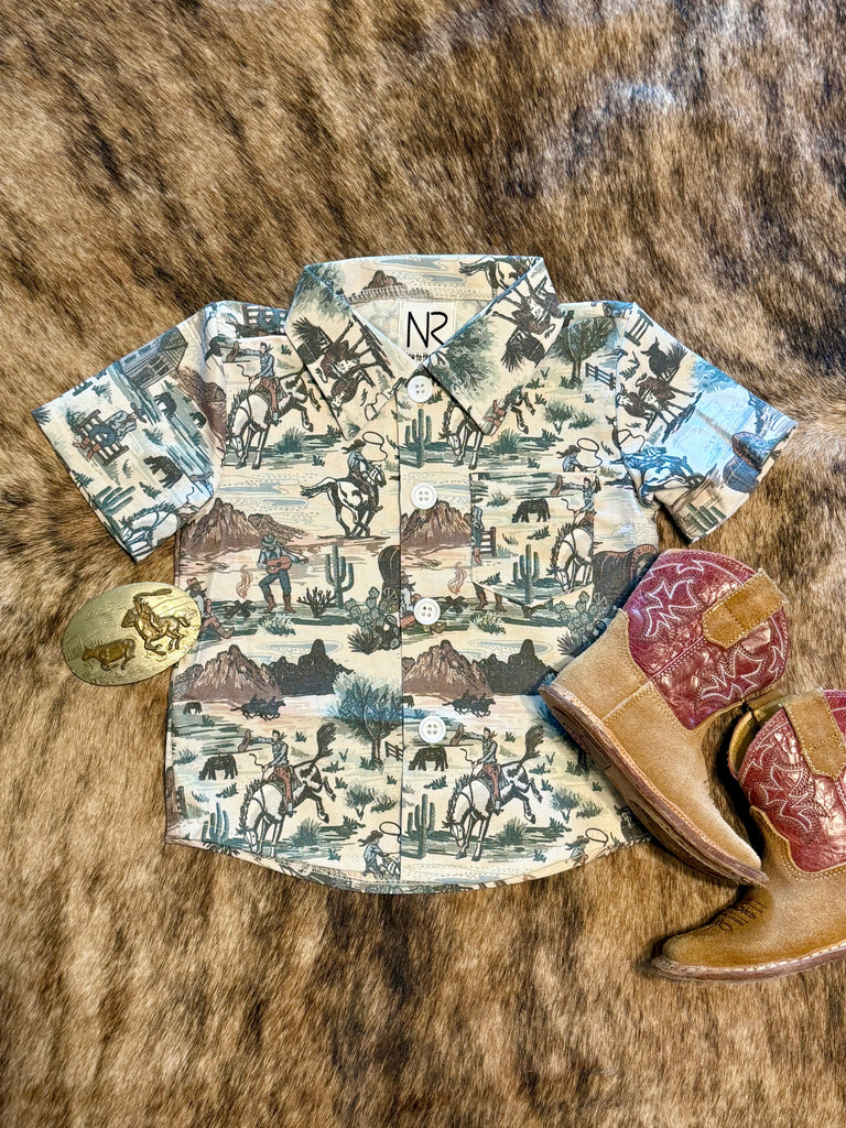 Our most popular print on a high-quality fabric! This button down is sure to turn heads, true to size fit. Model is a true 3T in most items, 33lbs, and he has plenty of room in the 3T top.